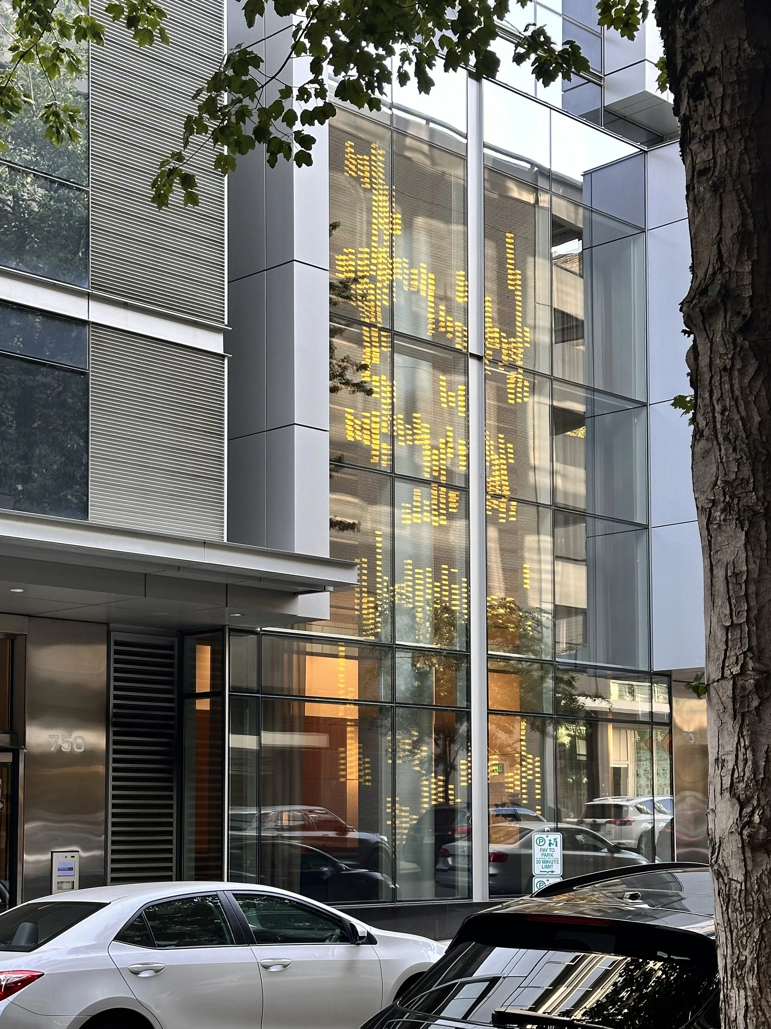 In summer 2024, I collaborated with the Portland Bureau of Transportation (PBOT) on a large-scale temporary installation that covered two facades of a downtown parking structure with 3,000 pieces of inkjet-coated Dupont Tyvek ®. Over four days, I installed and later removed each brick-sized (2x8 in) rectangle using a platform lift. The modular design explored how small units combine into larger systems, reflecting the collective efforts of Portlanders to revitalize the city center.