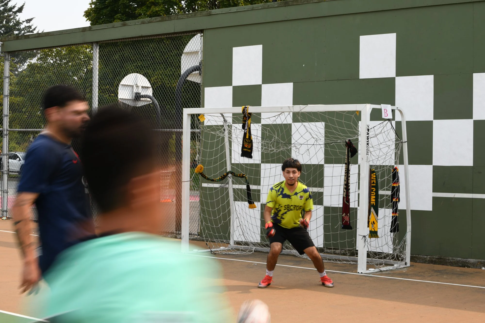 Fusing sport and art, the installation channels the speed, strategy, and spatial tension of soccer through a bold checkerboard grid. Sixty-five white DuPont Tyvek® squares—each 2 × 2 feet and tough enough for the elements—wrapped both sides of the court wall to form a double-sided backdrop for Street Soccer PDX’s inaugural Laundry Open Cup, the culminating tournament of the Summer 2024 LNDRY Street Circuit. The pattern echoes both the precision of play and the geometry of the city, linking the game to the streets and communities that power it.